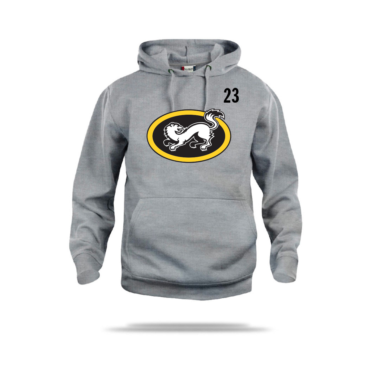 Resori helmassa ja hihansuissa. Hupussa kiristysnyöri, edessä tasku. Taskussa kuminauhapidike kännykälle/musiikkilaitteelle. Kauluksessa kiinnityslenkki ja taskun sisäpuolella aukko kuulokejohtoa varten. 65% polyesteriä ja 35% puuvillaa. Hinta sisältää seuralogon painatuksella. Voit myös valita tuotteeseen pelinumeron tai nimen painatuksella. Hinta päivittyy valinnan mukaan.