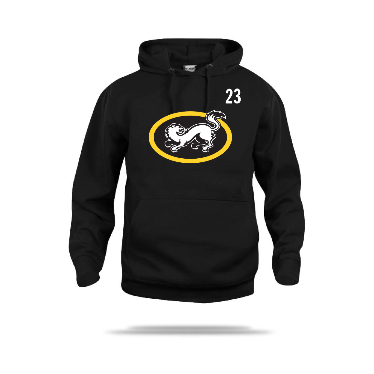 Resori helmassa ja hihansuissa. Hupussa kiristysnyöri, edessä tasku. Taskussa kuminauhapidike kännykälle/musiikkilaitteelle. Kauluksessa kiinnityslenkki ja taskun sisäpuolella aukko kuulokejohtoa varten. 65% polyesteriä ja 35% puuvillaa. Hinta sisältää seuralogon painatuksella. Voit myös valita tuotteeseen pelinumeron tai nimen painatuksella. Hinta päivittyy valinnan mukaan.