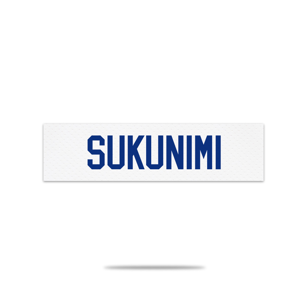 Sublimoitu nimilappu samasta materiaalista kuin pelipaita.