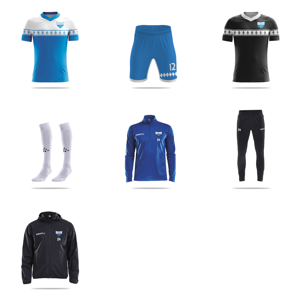 Pelipaidan (koti+vieras), shortsit, sukat, Half zip treenipaidan, verkkahousut sekä sadetakin.
